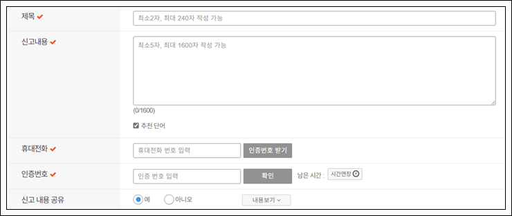 6. 휴대전화 인증 및 신고내용 공유여부 선택