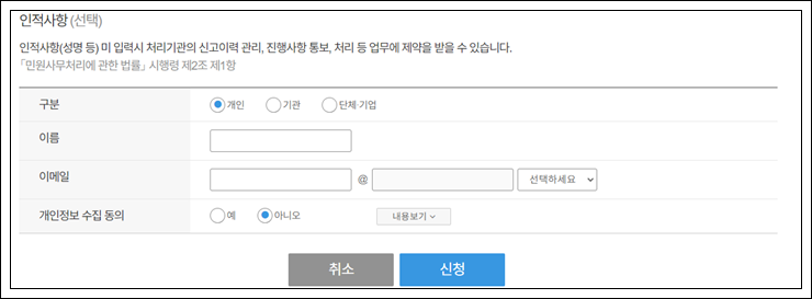 4. 마지막으로 개인 인적사항을 입력하는데 이름과 이메일. 개인정보 수집동의 후 신청을 누르면 신고가 완료됩니다.