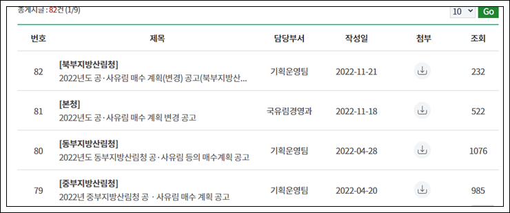 사유림 매수 계획은 관할 국유림관리소에서 관할지역을 대상으로 계획물량과 기획예산 등을 책정하여 진행하고 있습니다.