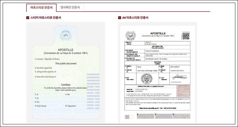 외교부는 여권사실증명 4종(여권정보증명서, 여권발급기록증명서, 여권실효확인서, 여권발급신청서류증명서)에 대하여 온라인 아포스티유 인증서 발급 서비스를 제공합니다.
