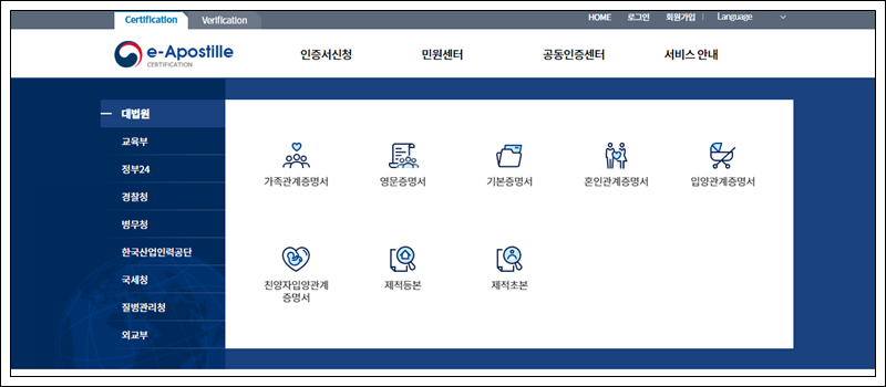 (여권정보증명서,여권발급기록증명서,여권실효확인서,여권발급신청서류증명서)에 대하여 온라인 아포스티유 인증서 발급 서비스 제공