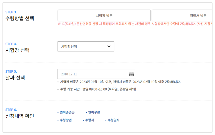 5. 운전면허증 종류와 영문인지 일반인지를 구분하고 수령방법을 선택합니다. 그리고 시험장을 선택하고 날짜를 확인을 합니다. 해당 사항을 모두 확인하면 다음으로 진행이 됩니다.