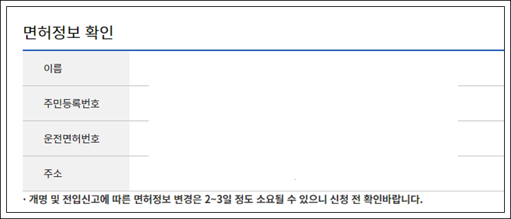 4. 개인정보 동의 및 면허증 재발급 관련 개인정보 등 약관 동의 후 면허정보를 확인합니다. 재발급이기 때문에 기존 면허정보를 확인하고 재발급 안내 내용도 확인 절차를 거칩니다.